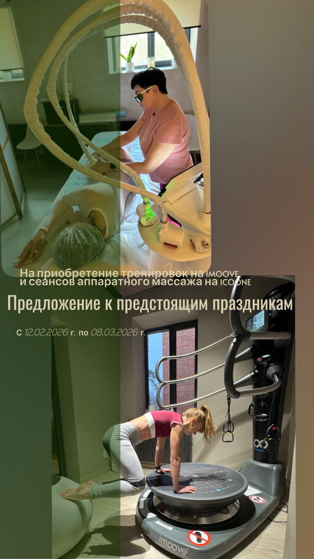 В предверии Дня всех влюбленных и 8-го марта мы запускаем специальное предложение на посещение индивидуальных тренировок на IMOOVE и сеансов аппаратного массажа на ICOONE.